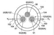 そして、上記パージガス流通用気密室62A、62Bに対して不活性ガスを供給するために、前記不活性ガス供給手段63(図1参照)が設けられている。具体的には、この不活性ガス供給手段63は、図1乃至図3にも示すように、上記パージガス流通用気密室62A、62Bへ不活性ガスを導入する不活性ガス導入路150と、上記パージガス流通用気密室62A、62Bから導入された不活性ガスを排出させる不活性ガス排出路152とを有している。 The inert gas supply means 63 (see FIG. 1) is provided to supply the inert gas to the purge gas circulation