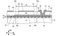 第1導電層40がパターニングされる際、図3(B)に示すように、第3方向230における一方の端面41はテーパー状の側面を有するように形成される。これにより、端面41が形成される。また、第1導電層40がパターニングされた後、上面42も同時に形成される。端面41の位置は、第2方向220から見て、第1領域面33と重なる領域外であってもよいし、図示はしないが、第1領域面33と重なる領域内であってもよい。 When the first