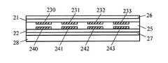 図2に示す液晶表示パネルは、2片の基板、上基板21及び下基板22を有する。2片の基板の間に液晶25を注入する。上表示電極アレイ230,231,232,233は、上基板21上に鍍金される。下表示電極アレイ240,241,242,243は、下基板22上に鍍金される。上表示電極の1つ230及び相応する下表示電極240は、液晶表示パネルの1つの画素(pixel)を表示することに用いる。上基板21の下に上偏光片26を有し、下基板22の上に下偏光片27を有する。背光板28は、下偏光片27の下に位置する。FIG. 2 is a transparent liquid crystal display (LCD) panel in which the present invention can be used.