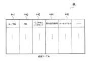 図2は、認証テーブル44の一例を示した図である。図示する認証テーブル44は、携帯端末1毎に、ユーザID441、PIN(Personal Identification Number)442、ワンタイムパスワード443、個体識別番号444、メールアドレス445、などを有する。  FIG. 2 is a diagram illustrating an example of the authentication table 44. The illustrated authentication table 44 includes a