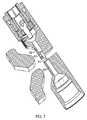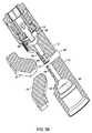 シンクロサイクロトロン1で使用するためのPIG形状イオン源が、図3Aおよび図3Bに示されている。図3Aを参照すると、イオン源18は、ガスを受け取るためのガス供給器39を収容するエミッタ側38a、および反射器側38bを含む。ハウジングまたは管44は、後述のようにガスを保持する。図3Bは、ダミーディー12を貫通しRFディー10に隣接するイオン源18を示す。動作の際、RFディー10とダミーディー12の間の磁界により、粒子(例えば陽子)が外に向かって加速する。加速は、プラズマカラムの周りでらせん状になり、粒子〜プラズマカラムの半径が累進的に増大する。このらせん状加速は、図5および図6で43と表示されている。らせんの曲率半径は、粒子の質量、RF電界によって粒子に与えられたエネルギー、および磁界の強さによって決まる。 A PIG-shaped ion source for use with the