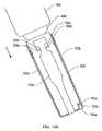 内側キャップ602および外側キャップ606はまた、第1の脚702a−702dから突出する、上部の内側に面する鉤703a−703hを介して相互に固定される。上部の内側に面する鉤703a−703hは、コネクタ604の遠位端(すなわち、ニードル端部)の方向を向く、先端部704a−704pを含む。図13Cおよび13Dに示されるように、これらの鉤は、その近位端付近でコネクタ604の外辺部の周りで離間し、第1の脚のそれぞれ(例えば、702a)は、2つの内側に面する鉤(例えば、703a−703b)を有し、また、各鉤は、一対の鉤先端部(例えば、704a−704b)を含む。いくつかの実施形態では、上部の内側に面する鉤703a−703hは、図13A−13Dに示されるように凹状である。これらの鉤は、内側キャップ602がコネクタ604内に嵌合されると、内側キャップ602に係合するように成形される。より具体的には、鉤先端部(例えば、704aおよび704b)は、鉤先端部が、凹状表面の2つの端部(例えば、内側に面する鉤703)に配置されるように、それらが内側キャップ602に係合する時に、相互に対して反力を作用させる。いくつかの実施形態では、上部の内側に面する鉤703a−703hは、第1の脚702a−702dの本体に対してある角度で配置される。これは、図13Dにより具体的に示される。このような構成は、ユーザが、針先キャップ112を遠位に引っ張ると、付加された突出部(すなわち、第1の脚702に対する鉤703の傾斜配列)が、鉤先端部704a−704pをより確実に内側キャップ602内に食い込ませることができるようになるので、内側キャップ602とコネクタ604との間の係合を増大させ得る。図13Dに示されるように、第1の脚702bの上部分711の長手軸710は、上部の内側に面する鉤703cの中心軸712に対して角度αで配置される。中心軸712は、第1の脚702bの長手軸710に対して約3度と約30度との間で配置され得る。