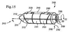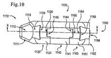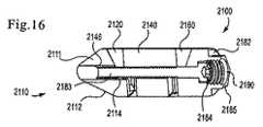 図18〜図19に示されている通り、遠位保持部材2120の第1の係合面2122は、遠位保持部材2120の第2の係合面2123に平行でない。前述の通り、嵌合している突起部および溝部、ならびに第1の係合面2122と第2の係合面2123との平行でない配置は、集合的に、遠位保持部材2120を作動装置2111と中央本体2140との間に係止する。換言すれば、第1の溝部2124と作動装置2111の突起部2118とは、集合的に、第2の係合面2123に略垂直な方向の、作動装置2111に対する遠位保持部材2120の移動を制限し、第2の溝部2126と中央本体2140の遠位突起部2145とは、集合的に、第2の係合面2123に略垂直な方向の、中央部分2140に対する遠位保持部材2120の移動を制限するので、遠位保持部材2120は、作動装置2111が移動しない限り、移動することができない。この配置により、遠位保持部材2120が作動装置2111および/または中央本体2140から不注意で分離されることが防止される。  As shown in FIGS. 18-19, the