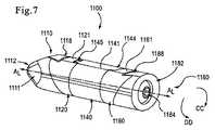 インプラント1100を身体から除去しかつ/または身体内に再配置するために、例えば除去器具(挿入器具と似ている可能性がある)により、図7に矢印DDで示されているように、駆動ねじ1183を回転させる。駆動ねじを方向DDに回転させることにより、作動装置1111の突起部1118の蟻継ぎ構成(dovetail configuration)および/または器具係合部材1182の突起部1188の蟻継ぎ構成は、遠位保持部材1120と近位保持部材1160とを第1の構成へ引き戻す。インプラント1100が第1の構成になった後、医師が、インプラント1100を身体から除去しかつ/またはインプラント1100を身体内に再配置することができる。  Drive to remove