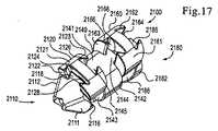 同様に、駆動ねじ2183が図15に矢印CCで示されているように回転した場合、器具係合部材2182の係合面2186は、近位保持部材2160の第1の係合面2162に軸力を掛ける。器具係合部材2182の係合面2186は、長手方向軸ALに対して鋭角なので、係合面2186を介して近位保持部材2160の第1の係合面2162に伝達される軸力の成分は、図18の矢印AAで示されている方向を有する。換言すれば、器具係合部材2182により近位保持部材2160に掛けられる力の成分は、長手方向軸ALに略垂直な方向を有する。この力により、近位保持部材2160は、器具係合部材2182の係合面2186上を滑動し、近位保持部材2160は、方向AAに移動し、第2の構成へ移行する。近位保持部材2160が器具係合部材2180の係合面2186上で所定の距離を滑動すると、器具係合部材2180の係合面2186の一部が、中央部分2140の近位係合面2142に接触し、近位保持部材2160がさらに滑動するのを防止する。インプラント1100と同様に、インプラント2100が第2の構成にある場合、遠位保持部材2120および/または近位保持部材2160は、長手方向軸ALに略垂直な方向に、中央部分2140からオフセットされている。Similarly, when the