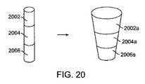 図1の実施形態では、近位セクションと中央セクションの間の遷移、ならびに中央セクションと遠位セクションの間の遷移は、幾分、急峻である。ストラット長が、セクションからセクションへと、ある長さからより短い長さへと変化している。これは、プロテーゼが拡大されたとき、段付きの領域を生ずる可能性がある。図19は、収縮した形態および拡大した形態の図1におけるものと同様のプロテーゼの概略図を示している。プロテーゼは、第1の領域1902、第2の領域1906、および中央領域1904を有しており、それぞれが、図1と同様のピーク部および谷部の幾何形状を有するが、各領域は異なるストラット長を有する。1つの領域から次の領域へとストラット長が劇的に変化する場合、段付き領域1908が、拡大された第1の領域1902a、第2の領域1906a、および中央領域1906bの間で形成される可能性がある。段付き領域を滑らかにすることが望ましいはずであり、また解剖学的構造によく一致しかつ血流に対してより滑らかな経路を設けるために、より滑らかにし、テーパを付けた拡大プロテーゼを提供することは望ましいはずである。したがって、プロテーゼを、ストラット長の変化、ならびに対応する性能特性の変化が、より漸進的であるように変更することができるが、これは、いくつかの隣接する管状リングのコースにわたりストラット長を徐々に変化させることにより達成することができ、したがって、近位、中央、および遠位セクションの間に別個の分割線がなくなる。図20は、図1と同様のプロテーゼであり、同様のピーク部および谷部の幾何形状を有するプロテーゼの概略図を示す。図20のプロテーゼは、収縮した形態で、第1の領域2002、第2の領域2006、および中央領域2004を有しており、また第1の領域2002a、第2の領域2006a、および中央領域2004aが拡大されたとき、結果として得られるプロテーゼの滑らかなテーパを有する。図20はまた、図1に関して上記で述べた同様のピーク部および谷部の幾何形状を含む。図14は、段付きの形状ではなく、よりテーパの付けられた拡大された形状を生成することになる、プロテーゼの領域間のさらに漸進的な遷移を有する管状のプロテーゼの例示的な実施形態を示す。図14のプロテーゼは、平坦に示されており、見やすくするために展開されている。  In the embodiment of FIG. 1, the transition between the proximal section and the central section, and the transition between the central section and the distal section are somewhat steep. The strut length changes from section to section, from one length to a shorter length. This can result in a stepped area when the prosthesis is enlarged. FIG. 19 shows a schematic view of a prosthesis similar to that in FIG. 1 in a contracted and expanded configuration. The prosthesis has a