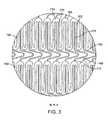 軸方向に延びるストラット170、172を有するコネクタ168は、隣接する管状リング160を共に結合する。中央セクション120では、隣接する管状リング上のピーク部164は、互いに同位相であり、したがって、一方の管状リング160における各ピーク部164は、隣接する管状リング160のピーク部164と結合される。しかし、近位セクション110とは異なり、中央セクションでは、一方の軸方向に延びるストラット170は、他方の軸方向に延びるストラット172よりもかなり長く、したがって、より長いストラット170は、ピーク部164の内側半径に結合され、より短いストラット172は、隣接する管状リング160のピーク部164の外側半径の頂点に結合される。より長いストラット170は十分細いので、隣接する管状リング160上の隣接するストラット162間で入れ子にすることができ、これは、収縮した形態にあるとき、プロテーゼの外形を縮小することを助ける。軸方向に延びるストラット170は、主要な耐負荷部材ではないので、ストラット162よりもかなり細くすることができる。軸方向に延びるストラット170、172はまた、プロテーゼ100の長手方向軸と実質的に平行であり、またコネクタ168は、「v」または山形状に形成される。コネクタ168の構成は、隣接する管状リング160の中心線間で相対的な動きがほとんどないか、全くないことを保証し、したがって、中央セクション120の短縮化は、半径方向の拡大中に最小となる。この実施形態では、短縮化は約2%以下である。図5は、プロテーゼ100の中央セクション120におけるコネクタ168を示している。コネクタ168の寸法は、近位セクションにおけるコネクタ148に関して前に述べたものと同様である。  A
