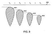 組織表面温度。超音波ベースの治療デバイス100の1つのパラメータは、局所の組織表面温度である。概して局所の組織表面温度を下げることは、組織表面下のより大きい深さに治療帯が作られるようにする傾向があり、一方逆に、温度を上げることは、より小さい深さに治療帯が作られるようにする傾向がある。これは、図8に図式に示され、この場合、一連の下降する表面温度T1>T2>T3>T4は、結果として、治療帯801、802、803および804を減少させる。従って、上皮の治療深さを調整する一つの方法は、冷却アセンブリ403によって制御され、維持されるように、局所の組織表面温度を修正することによる。  Tissue surface temperature. One parameter of the ultrasound-based treatment device 100 is the local tissue surface temperature. In general, lowering the local tissue surface temperature tends to allow a treatment zone to be created at a greater depth below the tissue surface, while increasing the temperature conversely reduces the treatment zone to a lower depth. There is a tendency to make it. This is shown schematically in FIG. 8, where a series of descending surface temperatures T1> T2> T3> T4 results in a decrease in