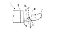 図5に示すように、マウスピース40を装着した患者41の口(生体内の自然の開口、肛門、鼻、耳なども含む)から内視鏡挿入部6を挿入する。アングルノブ5で内視鏡挿入部6の先端を湾曲させると、観察装置7で穿孔42を胃43の内部側(管腔器官の内部側)から確認できる。図6に示すように、観察装置(第二の観察装置)50を内視鏡1のチャンネル9に挿通する。観察装置50は、例えば、先端にカメラが付いたカテーテルである。また、観察装置50は、細長のファイバースコープでも良い。Next, the suturing method of this reference example will be described with reference mainly to FIGS. 5 to 12 are schematic diagrams for explaining the procedure, and the stomach is shown as an example of a luminal organ.