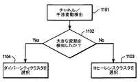 次に、各加入者は、継続的にパイロット記号の受信をモニターし、セル間干渉及びセル内トラフィックを含め、各クラスタのSINR及び/又は他のパラメータを測定する(処理ブロック102)。この情報に基づいて、各加入者は、相対的に性能が良好な(例えば、高SINR低トラフィックローディングの)1つ又は複数のクラスタを選択して、これらの候補クラスタに関する情報を所定のアップリンクアクセスチャネルを通して基地局にフィードバックする(処理ブロック103)。例えば、10dBより高いSINR値は、性能が良好であることを表す。同様に、クラスタ利用率50%未満も、良好な性能を表している。各加入者は、他よりも相対的に性能が良好なクラスタを選択する。この選択により、各加入者は測定されたパラメータに基づいて使用が望ましいと思われるクラスタを選択することになる。 Each subscriber then continuously monitors the reception of pilot symbols and measures the SINR and / or other parameters of each cluster, including inter-cell interference and intra-cell traffic (processing block 102). Based on this information, each subscriber selects one or more clusters with relatively good performance (eg, high SINR and low traffic loading) and passes information about these candidate clusters to a predetermined uplink. Feedback is provided to the base station through the access channel (processing block 103). For example, an SINR value higher than 10 dB indicates good performance. Similarly, a cluster utilization factor of less than 50% represents good performance. Each subscriber selects a cluster that performs better than others. With this selection, each subscriber will select a cluster that may be desirable to use based on the measured parameters.
