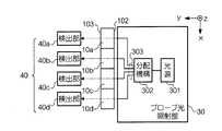 検出ユニット40の各検出部(40a,40b,40c,40d)は、検出手段の一例である。各検出部は、各セルの第3の面103から出射したプローブ光を偏光ビームスプリッター等によってP偏光成分とS偏光成分とに分離し、分離した光をフォトディテクタで受光する。各検出部は、フォトディテクタから出力されたP偏光成分とS偏光成分の光量に応じた電気信号を解析してプローブ光の偏光面の回転角度を求め、回転角度に応じた磁場の強度を求める。 Each detection part (40a, 40b, 40c, 40d) of the