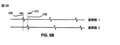 図5Aは、異なるパルス繰り返し周波数で定義される、異なる通信路(通信路1および2)を例示している。具体的には、通信路1に対するパルスは、パルス間の遅延期間502に対応するパルス繰り返し周波数を有する。反対に、通信路2に対するパルスは、パルス間遅延期間504に対応するパルス繰り返し周波数を有する。この技術は、したがって、これら2つの通信路間でのパルス競合の可能性が比較的低い擬似直交通信路を定義するために用いられる。具体的には、パルス競合の可能性の低さは、パルスに対して低デューティサイクルを用いることにより達成される。例えば、適切なパルス繰り返し周波数を選択することにより、所与の通信路に対する実質的に全てのパルスが、任意の他の通信路に対するパルスとは異なる時間に送信される。 FIG. 5A illustrates different channels (