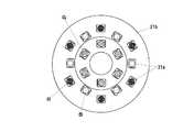 図8及び図9に示すように、ベース部材21の略中央部には、複数の発光素子21aが実装された円形状の基板21bが実装面側を上向きにして配設されている。発光素子21aは、LEDであり、表面実装型のLEDパッケージである。このLEDパッケージが基板21bの中央部を中心として円周上に2列に亘って実装されている。  As shown in FIGS. 8 and 9, a