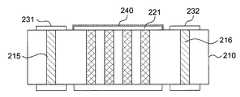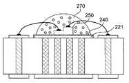 その後、図3に示すように、第1ビアホールH1、H2、H3、H4内に金属物質を充填して4個の第1放熱ビア211、212、213、214を形成する。そして、第2ビアホールH5、H6内に金属物質を充填して2つの第2放熱ビア215、216を形成する。このとき、第1放熱ビア211、212、213、214、および第2放熱ビア215、216は、アルミニウム(Al)、銅(Cu)、モリブデン(Mo)、タングステン(W)、銀(Ag)、および半田のうち少なくとも1つ以上の金属物質を含んでもよい。  Thereafter, as shown in FIG. 3, the first via holes H1, H2, H3, and H4 are filled with a metal material to form four first