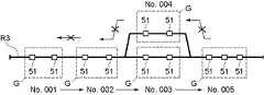 例えば、図7中の矢印が示すように、路線R3において鉄道車両13が区間番号001の区間G、区間番号002の区間G、区間番号003の区間G、区間番号005の区間Gの順序で進行する場合には、区間番号001の区間Gに属する各RFIDタグ51のID情報が含まれる要素データにおける区間番号は「001」であり、進行方向情報は「なし」(例えば「000」)である(区間番号001の区間Gは路線R3の始点である)。また、区間番号002の区間Gに属する各RFIDタグ51のID情報が含まれる要素データにおける区間番号は「002」であり、進行方向情報は「001」である。また、区間番号003の区間Gに属する各RFIDタグ51のID情報が含まれる要素データにおける区間番号は「003」であり、進行方向情報は「002」である。また、区間番号005の区間Gに属する各RFIDタグ51のID情報が含まれる要素データにおける区間番号は「005」であり、進行方向情報は「003」である。  For example, as indicated by the arrow in FIG. 7, on the route R3, the
