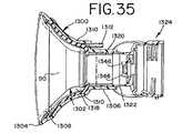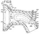 剛性ハウジング292Aは、使用者の乳房が主として受け入れられる領域と関連した、ハウジングの乳房受け部部分を構成する円筒体として形成された前部分を含む。円筒体の上流端は外方に湾曲したリップ又はリム296を有し、下即ち下流端298は、環状溝302を構成するように円筒体の内側壁面293から間隔を隔てていて、内方に突出した環状の出っ張り300を有する。環状溝302及びリップ296は、可撓性内シールド部の周りに延び、且つ溝302内に受け入れられる環状リップ又はフランジ346と、リップ296にスナップ嵌めする342及び344のところで可撓性内シールド部の前端によって構成された溝とによって可撓性内シールド部394を剛性外シールド部292A内にしっかりと固定し且つ位置決めする。