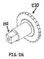 図2N−2Uは、回転可能な引張部材(205)の種々の構成要素をさらに詳細に示す。最初に図2Nおよび2Oを参照すると、歯車(220)は、その歯のそれぞれの間の歯間距離(230)を有する。この歯間距離は、テザーが引張られているときに引張力を増加させることができる、離散間隔を確立する。歯車(220)の各歯の間の歯間距離は、均一として示されているが、いくつかの変化例では、歯車は、異なる距離で相互から分離している歯を備えてもよい(すなわち、距離のうちの少なくとも2つが、相互とは異なってもよく、例えば、距離は、歯車の円周全体に沿って変化してもよい)。ある変化例では、歯間距離(230)は、例えば、約0.1インチから約0.3インチであってもよい。歯間距離(230)は、例えば、所望のレベルのテザー引張の精度に基づいて選択されてもよい。歯間距離が小さいほど、(すなわち、テザー引張力がより小さい増分で調整されるため)テザーにかかる引張力がより正確に調整されてもよいことを理解されたい。具体的には、ここで図2Nを参照すると、歯車(220)の中心軸上の長方形の要素(232)が、歯車(220)を引張車輪(202)に連結する。しかしながら、歯車を引張車輪に連結するために、他の形状および/または取付方法が使用されてもよい。例えば、歯車は、永久接着剤、溶接、および/またはネジを使用して、引張車輪に連結されてもよい。 2N-2U show in more detail the various components of the rotatable tensioning member (205). Referring initially to FIGS. 2N and 2O, the gear (220) has an inter-tooth distance (230) between each of its teeth. This interdental distance establishes a discrete spacing that can increase the pulling force when the tether is being pulled. The inter-tooth distance between each tooth of the gear (220) is shown as uniform, but in some variations, the gear may comprise teeth that are separated from each other at different distances (ie, , At least two of the distances may be different from each other, for example, the distance may vary along the entire circumference of the gear). In some variations, the interdental distance (230) may be, for example, from about 0.1 inch to about 0.3 inch. The interdental distance (230) may be selected based on, for example, a desired level of tether tension accuracy. It should be understood that the smaller the interdental distance, the more accurately the tensile force applied to the tether may be adjusted (ie, because the tether tensile force is adjusted in smaller increments). Specifically, referring now to FIG. 2N, a rectangular element (232) on the central axis of the gear (220) connects the gear (220) to the tensioning wheel (202). However, other shapes and / or attachment methods may be used to connect the gear to the tensioning wheel. For example, the gear may be coupled to the tensioning wheel using permanent adhesive, welding, and / or screws.