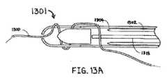 一実施例として、ここで図5Aおよび5Bを参照すると、いくつかの変化例では、テザー(534)は、一方の端にループ(506)を備えるラッソ(lasso)(504)を使用して、デバイス(500)に装着されてもよい。テザー(534)の一方の端は、ラッソ(504)のループ(506)を通される。次いで、ラッソ(504)は、デバイス(500)にテザー(534)を装着するために、デバイス(500)の縦軸に沿って引かれてもよい(図5A)。図5Bに示された代替的実装では、デバイスにテザー(580)を装着するために、ループ(555)を有するラッソ(554)が、デバイス(550)の中の側孔(558)を通して引かれてもよい。デバイス(500)またはデバイス(550)は、ロックおよび/または切断等の1つ以上の機能を果たすために使用されてもよい。ラッソは、例えば、ワイヤ、縫合糸、ケーブル、ひも、またはモノフィラメント等の、従来の材料からできていてもよい。ラッソは、ループ(図5Aおよび5Bに示されるような)、フック、コイル、管、穴を有する細長い要素、またはテザーを「把持」することができる任意の他の構造あるいは材料を備えてもよい。 As one example, referring now to FIGS. 5A and 5B, in some variations, the tether (534) uses a lasso (504) with a loop (506) at one end, It may be attached to the device (500). One end of the tether (534) is passed through the loop (506) of the lasso (504). The lasso (504) may then be pulled along the longitudinal axis of the device (500) to attach the tether (534) to the device (500) (FIG. 5A). In an alternative implementation shown in FIG. 5B, a lasso (554) with a loop (555) is pulled through a side hole (558) in the device (550) to attach a tether (580) to the device. May be. Device (500) or device (550) may be used to perform one or more functions such as locking and / or cutting. The lasso may be made of conventional materials such as, for example, wires, sutures, cables, laces, or monofilaments. The lasso may comprise a loop (as shown in FIGS. 5A and 5B), a hook, a coil, a tube, an elongated element with a hole, or any other structure or material capable of “gripping” a tether. .