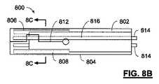図8A−8Cに示されるように、2本のNitinol平坦ワイヤ(806)および(808)が、増進した剛性を有する細長い部材を提供するように、細長い部材(804)の壁(810)に埋め込まれる。Nitinolが説明されているが、他の材料が使用されてもよい。また、いくつかの変化例では、ロックデバイスは、平坦ワイヤを含まなくてもよく、または、1本だけの平坦ワイヤ、または2本より多くの平坦ワイヤを含んでもよい。 As shown in FIGS. 8A-8C, two Nitinol flat wires (806) and (808) are embedded in the wall (810) of the elongated member (804) so as to provide an elongated member with increased stiffness. It is. Although Nitinol is described, other materials may be used. Also, in some variations, the locking device may not include a flat wire, or may include only one flat wire, or more than two flat wires.