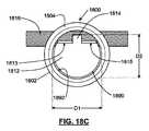 ロック要素のさらに他の変化例が使用されてもよい。例えば、いくつかの変化例では、ロック要素は、中空ロック部材と、中空ロック部材内で回転するように構成される回転可能なプラグとを備えてもよい。一実施例として、図18A−18Cは、それを通る2つの開口(1806)および(1808)を有する壁部分(1804)を備えるロック管(1802)を備えるロック要素(1800)を示す。ロック管(1802)は、管腔(1810)を有し、その内側に回転可能なプラグ(1812)(これは図18Cに示されるが、一方、図18Aおよび18Bは回転可能なプラグを有しないロック要素を図示している)が配置される。プラグ(1812)は、2つの平面(1813)と(1815)との間に位置する突起(1814)を有する。いくつかの変化例では、突起(1814)は、0.003インチから0.005インチの距離だけ平面(1813)および(1815)から突出してもよい。図18Cに示されるように、プラグ(1812)は、寸法(D1)と、寸法(D1)よりも小さい寸法(D2)とを有する。突起(1814)と、平面(1813)および(1815)とを備える、プラグ(1812)の一部分を除いて、プラグ(1812)の残りの部分は、形状が略円筒形である。しかしながら、任意の他の好適な回転可能なプラグ構成が使用されてもよい。プラグ(1812)が管腔(1810)内に配置され、テザー(1816)が開口(1806)および(1808)を通され、それにより、管腔を横断すると、突起(1814)がテザーに接触する。 Still other variations of the locking element may be used. For example, in some variations, the locking element may comprise a hollow locking member and a rotatable plug configured to rotate within the hollow locking member. As one example, FIGS. 18A-18C show a locking element (1800) comprising a locking tube (1802) comprising a wall portion (1804) having two openings (1806) and (1808) therethrough. Lock tube (1802) has a lumen (1810) and a rotatable plug (1812) inside it (this is shown in FIG. 18C, while FIGS. 18A and 18B do not have a rotatable plug). A locking element is shown). Plug (1812) has a protrusion (1814) located between two planes (1813) and (1815). In some variations, the protrusion (1814) may protrude from the planes (1813) and (1815) by a distance of 0.003 inches to 0.005 inches. As shown in FIG. 18C, the plug (1812) has a dimension (D1) and a dimension (D2) smaller than the dimension (D1). With the exception of a portion of plug (1812) comprising protrusions (1814) and flat surfaces (1813) and (1815), the remaining portion of plug (1812) is generally cylindrical in shape. However, any other suitable rotatable plug configuration may be used. Plug (1812) is placed within lumen (1810) and tether (1816) is threaded through openings (1806) and (1808) so that projection (1814) contacts the tether as it traverses the lumen. .