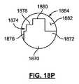 図18Oおよび18Pは、テザーを固定するために使用されてもよい、プラグの別の変化例を示す。いくつかの変化例では、プラグは、(例えば、ロック管の管腔内で)回転可能であってもよい。図18Oおよび18Pに示されるように、プラグ(1870)は、本体(1872)と、本体から延在する階段状構成(1874)の形態である複数の突起(示されるように3つの突起であるが、より多いまたは少ない数の突起も使用されてもよい)とを備える。各突起(1876)、(1878)、および(1880)の半径長さは、前の突起よりも長い。使用中、プラグ(1870)は、(例えば、プッシュ部材で管腔の中へプラグを前進させることによって)ロック管(1884)(図18P)または他のロック部材の管腔(1882)の中へ嵌合されてもよい。プラグが回転させられるにつれて、次第に長い突起が、管腔を横断するテザーに接触していてもよく、管腔内でテザーを固定してもよい。他の構成も使用されてもよい。例えば、いくつかの変化例では、回転可能なプラグは、異なる長さの複数の歯(例えば、各歯が前の歯よりも次第に長い)を備える、歯車形部分を備えてもよい。 18O and 18P show another variation of the plug that may be used to secure the tether. In some variations, the plug may be rotatable (eg, within the lumen of the lock tube). As shown in FIGS. 180 and 18P, the plug (1870) is a plurality of protrusions (three protrusions as shown) in the form of a body (1872) and a stepped configuration (1874) extending from the body. However, a greater or lesser number of protrusions may also be used). The radial length of each protrusion (1876), (1878), and (1880) is longer than the previous protrusion. In use, the plug (1870) is inserted into the lock tube (1884) (FIG. 18P) or other lock member lumen (1882) (eg, by advancing the plug into the lumen with a push member). It may be fitted. As the plug is rotated, progressively longer protrusions may contact the tether that traverses the lumen and may secure the tether within the lumen. Other configurations may also be used. For example, in some variations, the rotatable plug may comprise a gear-shaped portion comprising a plurality of teeth of different lengths (eg, each tooth is progressively longer than the previous tooth).