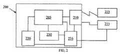 図2は、監視装置ユニット200の概略図である。監視装置ユニット200は、プロセッサ205を含む。プロセッサ205は、センサ215からのデータを受信する少なくとも1つの入力ポート210に結合される。プロセッサ205は、信号を送受信する送受信機220にも結合される。好適な実施形態では、プロセッサ205は、データ記憶部230に結合される。データ記憶部230は、センサ215から受信される所定量のデータを保持することができる。たとえばデータ記憶部230は所定時間(たとえば、1日、1週間、または1ヶ月)データを保持する、所定数の読取り(たとえば、10回の読取り、100回の読取り、1000回の読取り)を保持する、あるいはオペレーションセンタによって消去を指示されるまでデータを保持することができる。さらにデータ記憶部230は、オペレーションセンタからの指示(prompting)時に実行するプロセッサ205への命令を保持することができる。好適な実施形態では、プロセッサ205は、オペレーションセンタに送信するため、データ記憶部230に記憶されたデータの少なくとも1部をコンパイルする。 FIG. 2 is a schematic diagram of the