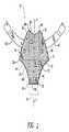 ここで図1に戻り、下部12は全体に漏斗様の形状を有し、長さ範囲約2cm〜約5cmの直線の下縁16と、長さ範囲約8cm〜約14cmの仮想境界線18(図1では点線で示されている)と、女性患者の骨盤の解剖学的形状に似せた複雑な(すなわち複合した)1対の弓形の凹形側縁20、22とによって画定されている。角部24、26はそれぞれ、下縁16が凹形側縁20、22に合流するところで形成される。下縁16は、最長約3cmまで延長することができることに注意されたい(図1に点線で示されている)。  Returning now to FIG. 1, the
