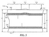 記載したように、いくつかの場合において処理ゾーン116におけるフィルム110の厚さ、すなわちd1’又はd2’は、選択的な圧力が熱処理中にゾーン116に実際に適用されなくても、非処理ゾーン112のフィルムの厚さとは若干異なる場合がある。この理由のために、図3はd1’をd1と僅かに異なるものとして、d2’をd2と僅かに異なるものとして記載する。移行ゾーン115はまた、一般的に図示され、「突出部」又は他の検出可能なアーチファクトが、選択可能な熱処理の結果としてフィルムの外側表面に存在し得る。しかしながらいくつかの場合において、処理は、隣接する処理ゾーンと非処理ゾーンとの間に検出可能なアーチファクトを生じない場合がある。例えば、いくつかの場合において、ゾーン間の境界を横断するように指を滑らせる観察者がゾーン間に突出部、隆起部又は他の物理的アーチファクトを検出しない場合がある。  As noted, in some cases, the thickness of