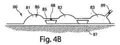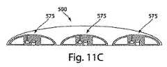 図11Aを参照すると、さらに別の非限定的実施例が示されている。この実施例では、デバイス500は、支持構造501と、関連流体輸送器システム503とを含む。流体輸送器システム503は、複数の針または極微針505を含むが、本明細書で論議されるような他の流体輸送器も使用されてもよい。また、図11Aには、針または極微針505を含有する陥凹508にチャネル511を介して接続される、センサ510も示されている。チャンバ513は、内蔵式真空チャンバであってもよく、チャンバ513は、例えば、コントローラまたはアクチュエータ(図示せず)によって制御されるように、チャネル511を介して陥凹508と流体的に連絡してもよい。この図では、デバイス500はまた、電気接続522を介してセンサ510に接続される、ディスプレイ525も含有する。デバイス500の使用の実施例として、流体が皮膚から引き抜かれると(例えば、血液、間質液等)、流体は、例えば、真空チャンバ513からの真空の作用により、センサ510によって決定されるチャネル511を通って流れてもよい。場合によっては、真空は、例えば、針または極微針505に接触し、皮膚の表面を貫通して、血液または間質液等の被検体の内部の流体へのアクセスを獲得するように、例えば、陥凹508に皮膚を引き込むために使用される。流体は、例えば、針505のサイズを制御し、それにより、貫通の深度を制御することによって、制御されてもよい。例えば、貫通は、例えば、間質液を採取するように表皮に、または、例えば、血液を採取するように真皮に限定されてもよい。流体、および/または流体内に存在する、または存在すると疑われている被分析物の決定時に、マイクロプロセッサまたは他のコントローラが、ディスプレイ525上に好適な信号を表示してもよい。以下で論議されるように、この図では、一例としてディスプレイが示されており、他の実施形態では、何れのディスプレイも存在しなくてもよく、他の信号、例えば、光、臭い、音、感触、味、または同等物が使用されてもよい。場合によっては、1つより多くの流体輸送器システムが、デバイス内に存在してもよい。例えば、デバイスは、繰り返し使用されることが可能であってもよく、および/またはデバイスは、例えば、連続的および/または同時に、被検体の上の1つより多くの場所で、流体を送達する、および/または引き抜くことが可能であってもよい。場合によっては、デバイスは、同時に、被検体に流体を送達し、被検体から流体を引き抜くことが可能であってもよい。図11Cを参照すると、1つより多くの流体輸送器システムを有するデバイスの非限定的実施例が図示されている。この図では、デバイス500は、被検体に流体を送達する、および/または被検体から流体を引き抜くための、本明細書で説明されるもの等の複数の構造を含有する。例えば、この実施例のデバイス500は、3つのそのようなユニットを含有するが、他の実施形態では、任意の数のユニットが可能である。この実施例では、デバイス500は、3つのそのような流体輸送器システム575を含有する。これらの流体輸送器システムのそれぞれは、特定の用途に応じて、同じまたは異なる構造を独立して有してもよく、それらは、本明細書で説明されるもの等の構造を有してもよい。  Referring to FIG. 11A, yet another non-limiting example is shown. In this example,