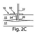 図2Cでは、皮膚に挿入することができ、真皮から表皮を少なくとも部分的に分離して、流体のプール領域20の生成を可能にするために使用することができる、皮下注射針またはナイフの刃等のカッター54を含む、同様のデバイスが示されている。例えば、カッター54は、分離化学物質をこの領域に送達することによって、および/または熱をこの領域に伝導することによって、真皮から表皮を分離してもよい。また、この実施例では、流体を送達し、および/または流体のプール領域から除去するために使用されてもよい、導管27も示されている。場合によっては、カッター54および導管27は、例えば、連続的または同時に、被検体に別々に投与されてもよい。別の実施形態では、両方は、皮膚10に投与される同じデバイスの一部であってもよく、場合によっては、例えば、カッター54を皮膚から除去することができる一方で、導管27が皮膚内にとどまるように、カッター54は、導管27から分離されてもよい。  In FIG. 2C, a hypodermic needle or knife blade that can be inserted into the skin and used to at least partially separate the epidermis from the dermis and allow the creation of a pooled