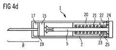 この接着連結は二つの面連結表面に亘って形成され得るであろう。接着連結を形成するために、プランジャーはニードルアセンブリーに対して低い力のみで押されなければならない。二つの連結エレメントは、克服されるべきより大きな力を要求するであろう鍵−ロック−機構において必要であるように、互いにカチッと閉まる必要はない。対照的に、もし、二つの連結エレメントが接着連結を形成するならば、二つのエレメントは非常に近位に近付けられるだけでよい。 This adhesive connection could be formed over two surface connection surfaces. In order to form an adhesive connection, the plunger must be pushed only with a low force against the needle assembly. The two connecting elements do not need to snap together as is necessary in a key-lock-mechanism that would require greater force to be overcome. In contrast, if two connecting elements form an adhesive connection, the two elements need only be brought very close together.