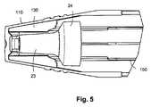 図5では、2つの把持表面110が互いに離れることで、ペンキャップと注射針キャップとの間に把持係合がもたらされ、これによって、ペン主要部からペンキャップを取り除く場合、使用状態で注射針ハブから注射針キャップを取り除くことができる。使用者が把持表面110で圧力を緩める場合、把持フランジ140は、ペンキャップを再び嵌めるまで所定の位置に注射針キャップを適切に保持するように機能する。点検用開口104は、注射針キャップの裾部24が所定の位置にあれば、使用者が制御可能となるように配置され、ペンキャップを取り除く必要がない。注射針アセンブリが取り付けられているものの注射針キャップがない場合は、使用者は開口を通して注射針ハブの遠位部を見ることができるようになる。一方、注射針ハブが取り付けられていない場合、注射針キャップは「空」のように見え、すなわち、ペンキャップがペン主要部に取り付けられるとき、開口104は、連結手段11の遠位端に遠位に配置される。  In FIG. 5, the two