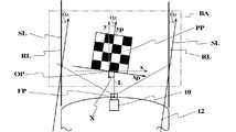 なお、Lはワールド座標原点を車体後端中央に設定するために使用するパラメータであるので、画像処理からLを算出する場合、パターンマット座標系におけるカメラ位置(x,y)のyに、車体後端中央とカメラ取り付け位置の水平距離のy軸成分を加えたものをLとして設定する。As shown in FIG. 5, in this embodiment, the horizontal distance between the pattern coordinate origin OP and the vehicle feature point FP (for example, the rearmost end of the