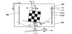 校正用パターンPPは、前記測定領域MA内で参照線RLの間に配置される。パターン形状としては、例えば、図2に示す同一の大きさの矩形パターンを白黒で交互に並べた市松模様を採用することができる。この市松模様の矩形の一辺の長さを定めておくと、測定用画像IM中にワールド座標系(x, y, z)での実際の長さの情報を得ることができるため、カメラ10の内部パラメータ及び外部パラメータの算出基準とすることができる。その他、本実施例では、キャリブレーションの方式に応じて、市松模様以外の様々なパターン形状も採用することができる。