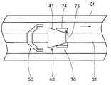 第2凸部50が有する一対の第2傾斜面54は、弾性部材70の当接部74の内幅W1をバネ部73の付勢力に抗して拡げる斜面として形成されている。つまり、第2傾斜面54は、一対の第2傾斜面54が構成する突起部52の外形幅を先端側から基端側にいくにしたがって連続的に大きくするように形成されている。そして、基端側外形幅寸法Woは、予め定めた寸法に設定されている。