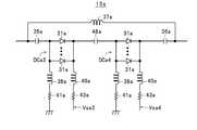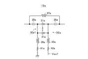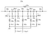 他の可変コンデンサ回路13bも、図5に示すように、上記した可変コンデンサ回路13aのダイオード回路DCa、2つのコンデンサ35a,36a、1つのインダクタ37a、3つのインダクタ38a,39a,40a、および3つの抵抗41a,42a,43aにそれぞれ対応するダイオード回路DCb、2つのコンデンサ35b,36b、1つのインダクタ37b、3つのインダクタ38b,39b,40b、および3つの抵抗41b,42b,43bを備え、可変コンデンサ回路13aと同一に構成されている。このため、可変コンデンサ回路13bの各構成要素の機能であって、対応する可変コンデンサ回路13aの構成要素と同一の機能については説明を省略する。 As shown in FIG. 5, the other