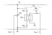 図15に示す容量付加回路13cでは、リレー67aは、その接点回路の一方の端子が固定コンデンサ63aに接続され、かつ接点回路の他方の端子が固定コンデンサ64aに接続されることで、固定コンデンサ63aと固定コンデンサ64aとの間に配設されている。また、リレー67aは、そのコイルの一方の端子は基準電位に接続され、コイルの他方の端子には、バイアス回路65aを構成する抵抗R1を経由して制御電圧Vsc1が供給(印加)される。 In the