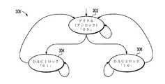 ステートマシン300は、それぞれ、DAC1またはDAC2がアンロック値(例えば、「00」)をセマフォレジスタ内に書き込むよう試みない限り、DAC1ロック状態304またはDAC2ロック状態306のままである。DAC1ロック状態304またはDAC2ロック状態306にあるとき(すなわち、DAC1またはDAC2がセマフォをロックしているとき)、セマフォモジュール200(図2)は、セマフォをロックしていない任意のDACによって提供される任意の値によってセマフォレジスタを上書きすることを拒絶することになる。例えば、DAC1ロック状態304にあるとき、セマフォモジュール200は、DAC2によって提供される任意の値によってセマフォレジスタを上書きすることを拒絶することになる。同様に、DAC2ロック状態306にあるとき、セマフォモジュール200は、DAC1によって提供される任意の値によってセマフォレジスタを上書きすることを拒絶することになる。セマフォをロックしているDACがアンロック値(例えば、「00」)をセマフォレジスタ内に書き込むと、ステートマシン300はDAC1ロック状態304またはDAC2ロック状態306のいずれかからアイドル状態302に遷移する。  The