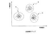 図4は、この正常範囲設定処理の過程において生成する特徴量マップの一例を示した図である。この特徴量マップの横軸及び縦軸は、設備状態データに含まれる冷媒温度、冷媒圧力などのいずれかのデータ項目により表される特徴量である。あるいは、複数のデータ項目を入力とする演算を行うことでデータ項目を次元圧縮して得られる特徴量としてもよい。なお、本実施の形態では2次元座標を例にして用いるが、特徴量マップの軸数を3軸以上として生成してもよい。マップ生成部12は、各軸の特徴量を各設備1の設備状態データの項目データ値に基づき設備1毎に算出して、特徴量マップ上にマッピングする。全ての設備1に対してマッピングを行うと、図4に例示したように、混合正規分布が表れてくると考えられる。なお、本実施の形態では、設備状態データに含まれる各データ項目を用いて特徴量マップの軸となる特徴量を設定したが、特徴量マップの軸を成す特徴量を決める際に、例えば設備1の製造年等設備機器に関する機器情報を合わせて用いるようにしてもよい。 FIG. 4 is a diagram illustrating an example of a feature map generated in the normal range setting process. The horizontal axis and the vertical axis of the feature amount map are feature amounts represented by any data item such as the refrigerant temperature and the refrigerant pressure included in the equipment state data. Or it is good also as a feature-value obtained by performing dimension compression of a data item by performing the operation which inputs a plurality of data items. In the present embodiment, two-dimensional coordinates are used as an example, but the number of axes of the feature amount map may be generated with three or more axes. The
