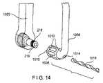 図13〜図16は、本発明の別の例示的実施形態による照準デバイス1000を示す。照準デバイス1000は、以下に強調される詳細を除けば、図4〜図5の照準デバイス200とほぼ同様である。照準デバイス1000は、ほぼ円筒形のかぎ状アーム1002と、長手部分1004と、尖端208とほぼ同様に形成される、カニューレを挿入された照準尖端1008を受け取るように構成されたかぎ状部分1006と、を備える。具体的には、カニューレを挿入された照準尖端1008は、医師または他の使用者による把持および操作に役立つように構成された、複数の長手方向の溝1010を有するほぼ円筒形の要素として形成される。照準尖端1008は、そこを通って延在する、照準アーム100のかぎ状部分1006を通って延在する孔1014と整列するように構成された、長手方向孔1012を備える。カニューレを挿入された照準尖端1008は、様々な直径のねじをそこに取り付けることを可能とするために、かぎ状アーム1006から取り外し可能に構成される。具体的には、カニューレを挿入された照準尖端1008は、選択的に取り外され、骨固定デバイス1032よりも大きなまたは小さな直径を有する骨固定デバイスへの取り付けを可能とするように構成された、またはそこを通してドリルビット1018または他のデバイスを挿入することを可能とするように構成された、別の尖端(図示せず)と交換されうる。同様に、以下により詳細に検討するように、そこを通して必要とされるドリルビット1018を挿入することを可能とするために、孔1014を必要に応じて寸法決めすることができる。カニューレを挿入された照準尖端1008は、その遠位端部に、橈骨茎状突起のほぼ中点に保持力を印加するために構成および寸法決めされた、1つまたは複数の棘部1016を更に備える。先に詳細に説明したように、照準デバイス100のかかる配置が、腱の合併症を回避するために、骨プレート100を骨10の分水界線に近接して置くことを可能とする。本発明の例示的なカニューレを挿入された照準尖端1008は、医師または他の使用者が、照準デバイス1000を目標のアライメントで骨上に配置した後に、骨に孔を開けるために、かぎ状部分1006を通してドリルビット1018を挿入することを可能とする。  13-16 illustrate an aiming