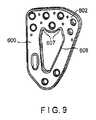 図9に示されるように、本発明の更に別の実施形態による骨プレート600は、骨プレート600の外形および窓608が異なる形状であることを除けば、骨プレート500とほぼ同様である。具体的には、骨プレート600の外形は、骨プレート100の外形とほぼ同様でありうる一方で、窓608は、第1壁602内へと延在する2つの陥凹607を有する長円形状に形成される。陥凹607は、第1壁602に隣接した骨ねじ(図示せず)の挿入を可能とするし、あるいは、そこを通した骨折部位の可視性を増大させるのに貢献する。  As shown in FIG. 9, a