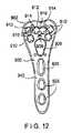 図11に示されるように、骨プレート800は、第1壁802において7つの可変角度のねじ穴810を含むが、その他の点では、上述のプレート700と同様に構成される。図12に示されるように、本発明の更に別の実施形態による骨プレート900は、その第1壁902が、プレート700のものと同様の可変角度の穴910に加えて、互いに隣接し、互いに開口している2つの可変角度の穴を含む可変角度の結合穴912を含むことを除けば、図10の骨プレート700とほぼ同様である。可変角度の結合穴912は、2つの中心開口部914であって、開口部914の近位端部が互いに交差するように、骨プレート900の近位表面(すなわち、骨の外側を向く面)における開口部914の直径よりも小さな距離で互いに隔てられた、それぞれの中心軸が隣り合う2つの中心開口部914を含む。加えて、中心開口部914の各々は、同じだけ離れた第4の周辺孔が2つの中心開口部914から互いに開口する間隙918の位置に置かれることによって定まる位置にある、3つの周辺孔916によって取り囲まれている。好適には、間隙918は、周辺孔916の各々によって形成される中心開口部914の壁における開口部よりも狭い。それ故、間隙918は、その中に挿入される骨ねじの頭部に係合するために利用可能な中心開口部914のねじ切り壁の範囲を減少させない。更に、骨プレート900の長手方向延長部940は、楕円形の結合穴926に加えて、2つのほぼ円形の結合穴928も備えている。骨プレート900は、その長手方向の中心線LCに沿ってほぼ対称となるように構成される。また、骨プレート900は、第1壁902上に設けられるほぼ円形の追加開口部909以外の点では図1の窓108とほぼ同様に形成される窓908も備え、開口部909は、窓908に隣接するように位置づけられ、窓908へと開口している。また、開口部909は、骨プレート900を通って、骨の外側を向く第1表面から骨に面する表面まで延在する。  As shown in FIG. 11, the