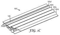 図1Aは、本発明の第1の態様、つまりマルチチャネルケーブル100を示している。この例示的な態様において、ケーブル100は積層構造であり、積層マルチチャネル(「LMC」)ケーブルと本明細書では呼ばれる。このように述べることは、本明細書で説明する例示的なマルチチャネルケーブルを形成するために積層以外のプロセスが用いられてもよいという意味で、限定を意図したものではない。 FIG. 1A illustrates a first aspect of the present invention, a