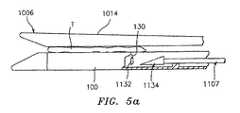 カートリッジ100は、カートリッジ100を介して遠位に平行移動する作動スレッド1134を含む。作動スレッド1134は、図5aに示されているように駆動バー1107によって遠位に駆動され、駆動バー1107は、ハンドル1002によって作動される。スレッド1134は、プッシャ1131と接触するカムウェッジを含み、該カムウェッジは、プッシャ1131と接触し、プッシャ1132を上方向に駆動させ、手術ファスナー130を配置し、それらをアンビル部材1104に向かって駆動させる(図5c)。特定の実施形態において、カートリッジ100は、スレッド1134を有し、該スレッド1134は、第1の内側ウェッジ1135と、第2の内側ウェッジ1130と、第1の外側ウェッジ1133と、第2の外側ウェッジ1137とを有する。第1の内側ウェッジ1135は、ファスナー保持スロット126の第1の内側の列128Aにおいてプッシャと接触し、第2の内側ウェッジは、保持スロット126の第2の内側の列128Cにおいてプッシャと接触し、第1の外側ウェッジは、保持スロット126の第1の外側の列128Bにおいてプッシャと接触し、第2の外側ウェッジは、保持スロット126の第2の外側の列128Dにおいてプッシャと接触する。図5cに示されているように、カムウェッジ1135は、互いに一体的に形成されるか、または、互いに対して取り付けられる。 The