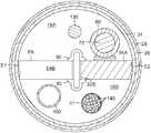 図1の例示する実施形態では、遠位アセンブリ15は、概して真っ直ぐな近位領域及び約360°旋回する少なくとも1つのループ、そうでない場合は、約720°旋回する2つのループを有する、概して円形の主領域を備える。近位領域98は偏向可能区域14に取り付けられ、主領域99は、マッピング及び/又はアブレーションのために複数の電極を保持する。図4、図5を参照すると、遠位アセンブリ15は、形状記憶支持部材72と、遠位アセンブリ15上に保持される電極のためのリード線140と、遠位アセンブリの長さ延在するカバーと、を含む。リード線140は、遠位アセンブリから偏向可能区域14の管腔半分の19Bを通って延在する、非導電性のシース41を通って、遷移区域65の空洞半分の67Bを通って、カテーテルシャフト12の管腔18を通って、かつ制御ハンドル16内に延在する遠位アセンブリ15上の電極に付着される。  In the illustrated embodiment of FIG. 1, the
