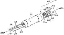 (13)  前記カテーテル本体の近位において、又はその近くに近位端を有し、かつ前記継ぎ手の遠位に遠位端を有する第1の圧縮コイルを更に備え、前記第1の圧縮コイルが、コイル管腔を有し、前記第1の引っ張りワイヤーセグメントの一部分が前記コイル管腔を通って延在する、実施態様11に記載のカテーテル。