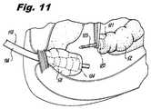 外科手術ステープル留め装置は、身体組織のセグメントを一緒に接合する目的のため、1つ以上の列の締め具、例えば、ステープルまたは二部の締め具を連続して、または同時に身体組織に適用するために外科医によって用いられる。そのような装置は、一般に、1対の顎または指のような構造を含み、その間に、接合されるべき身体組織が置かれる。ステープル留め装置が作動されるか、または「発射される」場合、長手方向に移動する発射バーが、顎のうちの1つにおいてステープル駆動部材に接触する。ステープル駆動部材が、身体組織を通して、ステープルを形成する反対側の顎におけるアンビルの中に外科手術ステープルを押しつける。組織が除去されるべき場合または分離されるべき場合に、ナイフ刃が、ステープルの線の間の組織を切断するために装置の顎の中に提供され得る。2. Background of Related Art Surgical stapling devices are used to join one or more rows of fasteners, such as staples or two-part fasteners in succession or simultaneously, for the purpose of joining together segments of body tissue. Used by surgeons to apply to tissue. Such devices generally include a pair of jaw or finger-like structures between which body tissue to be joined is placed. When the stapling apparatus is activated or “fired”, a longitudinally moving firing bar contacts the staple drive member at one of the jaws. A staple drive member presses the surgical staple through the body tissue and into the anvil in the opposite jaw forming the staple. A knife blade may be provided in the jaws of the device to cut tissue between the staple lines when the tissue is to be removed or separated.