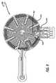 図4Aによれば、ZHF電気回路120は、可撓性基材101上に配置される。必要ではないが好ましくは、電気回路120の要素は、可撓性基材101の一方の表面上121に配置される。電気回路120は、少なくとも、導電性ヒータートレースと、温度センサーと、導電性接続トレース部分と、電気接触パッドと、を含む。ヒータートレース124は、ヒータートレース124のいかなる部分も延在していない、基材101のゾーン130を取り囲む、概ね環状のヒーター126を画定する。これに関して、ゾーン130は、ヒーターが動作するときに直接加熱されない。ゾーン130は、表面121の概ね円形の部分を占有する。更に特定すると、ゾーン130は、図4Aに図示した表面121の部分と、反対側表面の対応する部分(この図には描かれていない)と、それらの間の中実部分と、を含む、基材101の円柱状部分である。必要ではないが好ましくは、ゾーン130は、中央セクション105に中心合わせされ、ヒーター126と同心である。第1温度センサー140は、ゾーン130に形成された装着パッドに装着される。第2温度センサー142は、概ね環状のヒーター126の外側に配置された装着パッド上に装着される。好ましくは、これらの装着パッドはテール106の端部の概ね近くに(例えば、テールの球根状の端部107の中心又は中心近くに)形成される。第3温度センサー143は、概ね環状のヒーター126の外側に配置された装着パッド上に装着される。好ましくは、これらの装着パッドは、テール106(概ね第2温度センサー142の装着パッドとヒーター126の周縁近くとの間)に形成される。電気接触パッド(「接触パッド」)171は、タブ108内の表面121上に形成される。 According to FIG. 4A, the ZHF