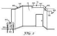 一態様では、遠隔通信ダクト140内のドロップ線(例えば、ファイバ)は、MDUの廊下に配置されるドロップアクセスボックス500(図1を参照)内に位置する標準カップリングを介して、サービスプロバイダ線に連結することができる。終端処理ドロップファイバなどのドロップ線、又は他の通信線を、入口点ボックス500’から住戸内の第2のアンカーポイントへ、好ましい態様では、遠隔通信ダクト140を介して壁コンセント920へ通すことができる。好ましい態様では、遠隔通信ダクト140は、住戸の壁、天井、カーペット下、床、又は内部角に沿って目立たない様式で配置され、これにより住戸の審美性は最小限しか影響を受けない。遠隔通信ダクト140は、その全体が参照により本明細書に組み込まれる米国特許公報第2011−0030190号に記載されるように、接着剤で裏当てされたダクトとして構成することができる。  In one aspect, the drop line (eg, fiber) in the