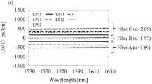 例えばα=1.89の負のDMDを有する6モードファイバとα=2.05の正のDMDを有する6モードファイバを同じファイバ長だけ接続することにより、伝搬モード数が6のモード遅延補償伝送路が実現できる。 For example, by connecting a 6-mode fiber having a negative DMD of α = 1.89 and a 6-mode fiber having a positive DMD of α = 2.05 by the same fiber length, a mode delay compensation transmission having a propagation mode number of 6 is provided. A road can be realized.